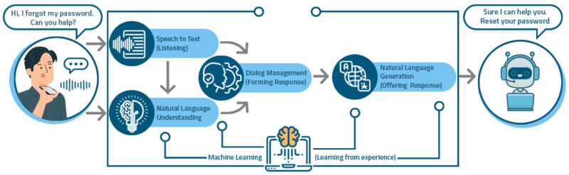 - Với đầu vào là giọng nói: AI áp dụng công nghệ Nhận dạng giọng nói (ASR) để chuyển đổi âm thanh thành văn bản. Sau đó, NLU sẽ tiếp tục phân tích nội dung văn bản đã chuyển đổi.