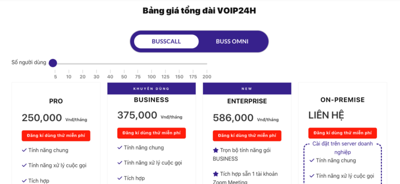 • Gói Pro: giá 250.000 VNĐ/tháng với 5 số máy nhánh