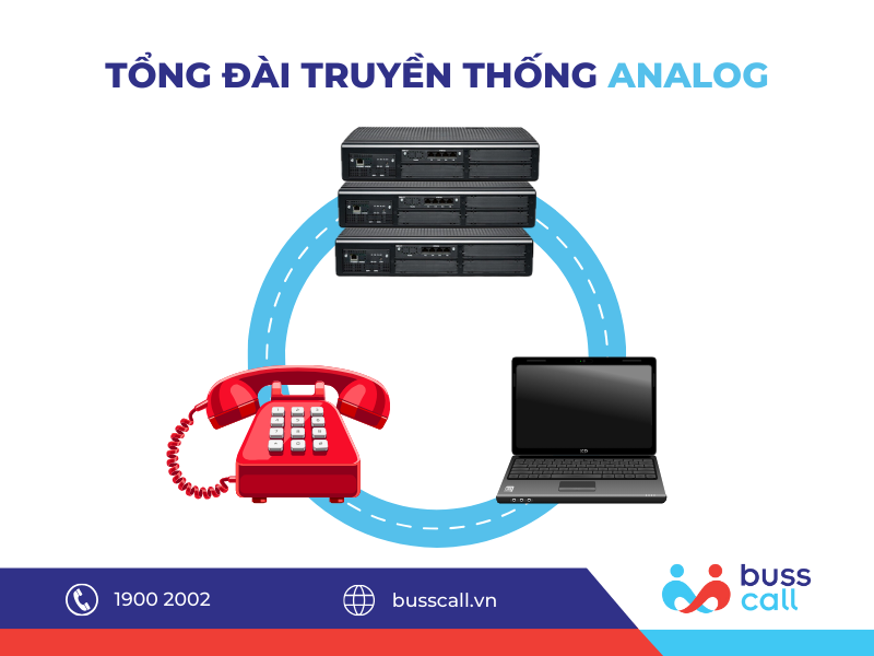 Analog là loại tổng đài điện thoại xuất hiện từ khoảng 20 năm trước, hoạt động dựa trên công nghệ Analog. Theo đó, công nghệ Analog hoạt động thông qua đường Line bưu điện. Cụ thể, khi khách hàng đăng ký sử dụng dịch vụ, bưu điện sẽ kéo đường dây đến văn phòng công ty. Bạn sẽ phải trang bị thiết bị phần cứng, chia thành các máy lẻ đến các phòng ban khác nhau nếu muốn sử dụng tổng đài Analog.